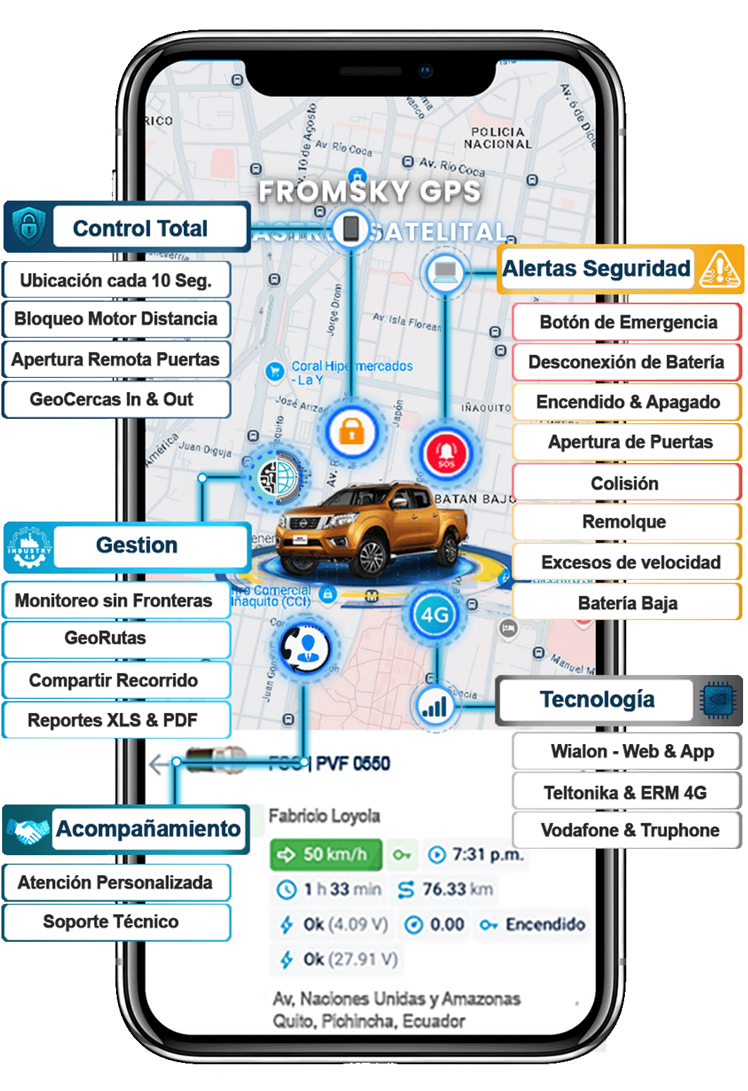 FromSky GPS ofrece monitoreo y rastreo satelital 4G con la mejor tecnología del mundo: Wialon,Teltonika, ERM, Vodafone y Truphone.